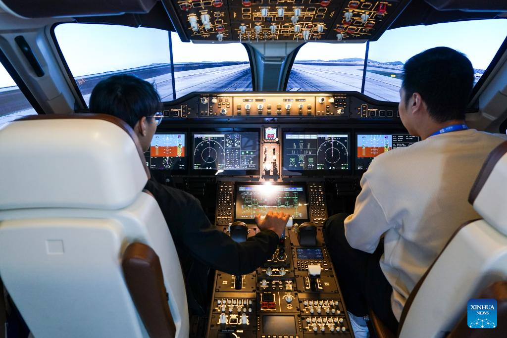 People try a simulated cockpit of the C919 large passenger aircraft during the 11th China (Wuhu) Popularized Science Products Exposition in Wuhu, east China's Anhui Province, Oct. 21, 2023. The expo kicked off here on Saturday. (Xinhua/Du Yu)