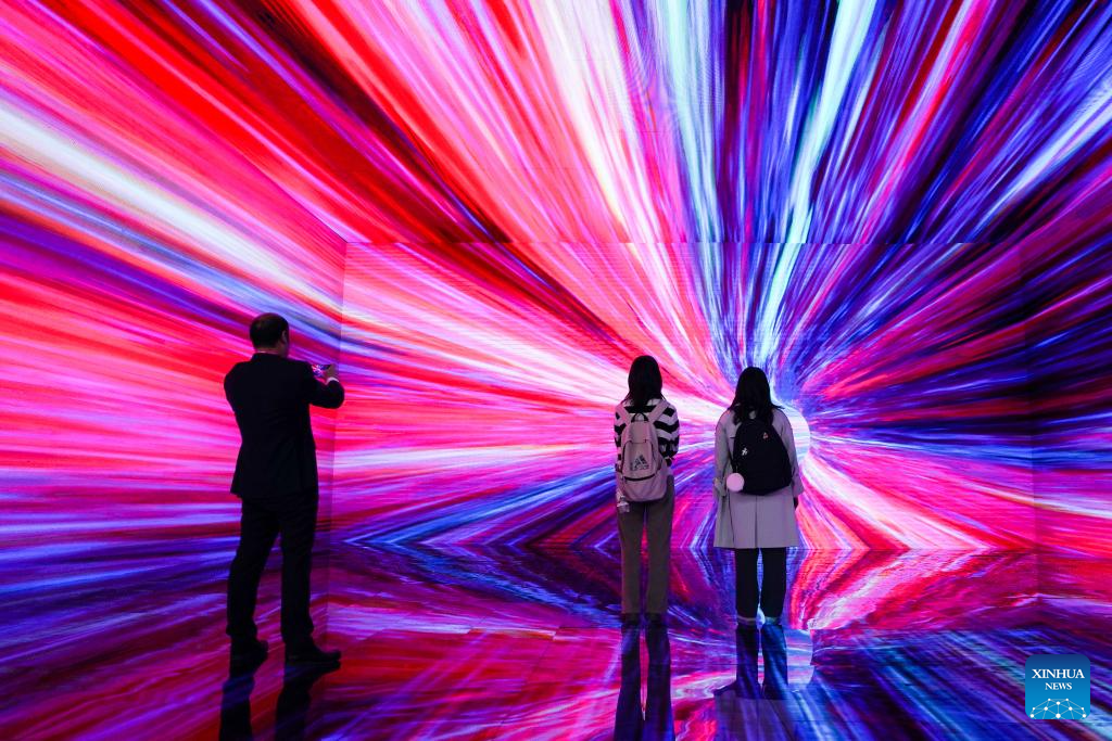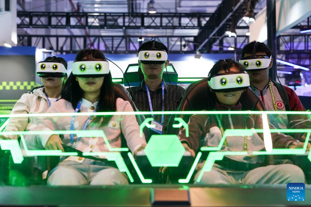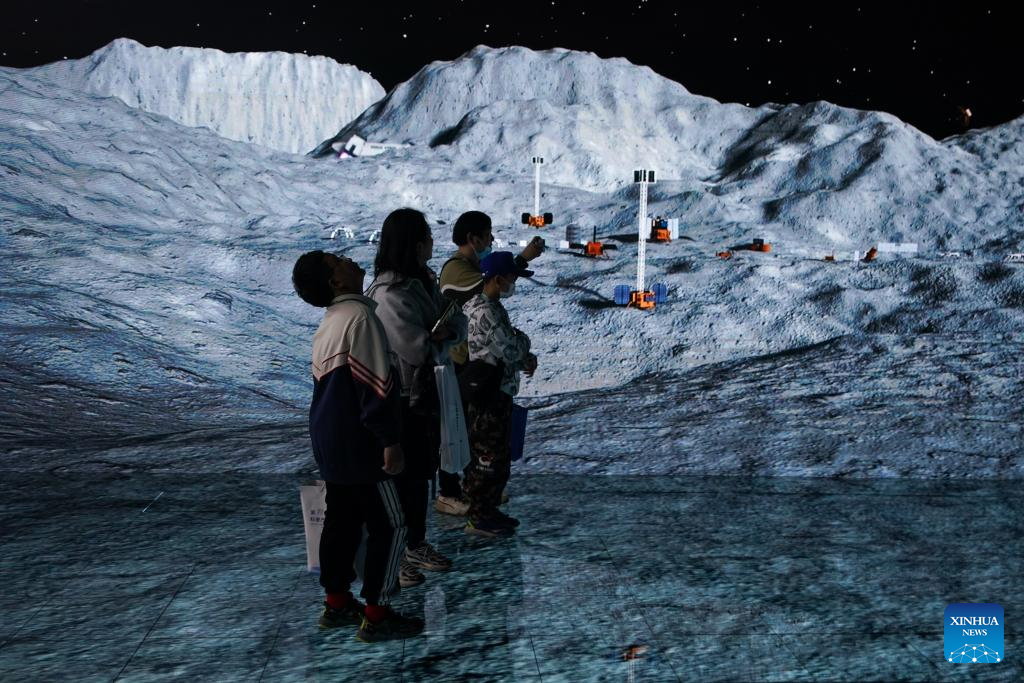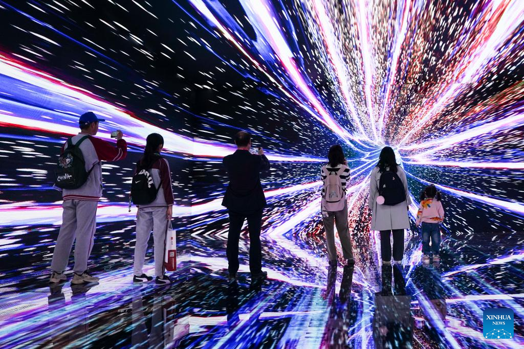 Visitors try an immersive environment of astronautic metaverse, a popular science program presented by Xinhua News Agency, during the 11th China (Wuhu) Popularized Science Products Exposition in Wuhu, east China's Anhui Province, Oct. 21, 2023. The expo kicked off here on Saturday. (Xinhua/Du Yu)