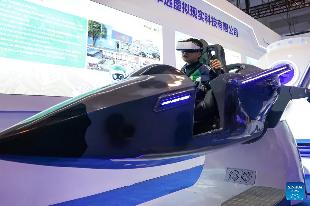 A child tries VR devices during the 11th China (Wuhu) Popularized Science Products Exposition in Wuhu, east China's Anhui Province, Oct. 21, 2023. The expo kicked off here on Saturday. (Xinhua/Du Yu)