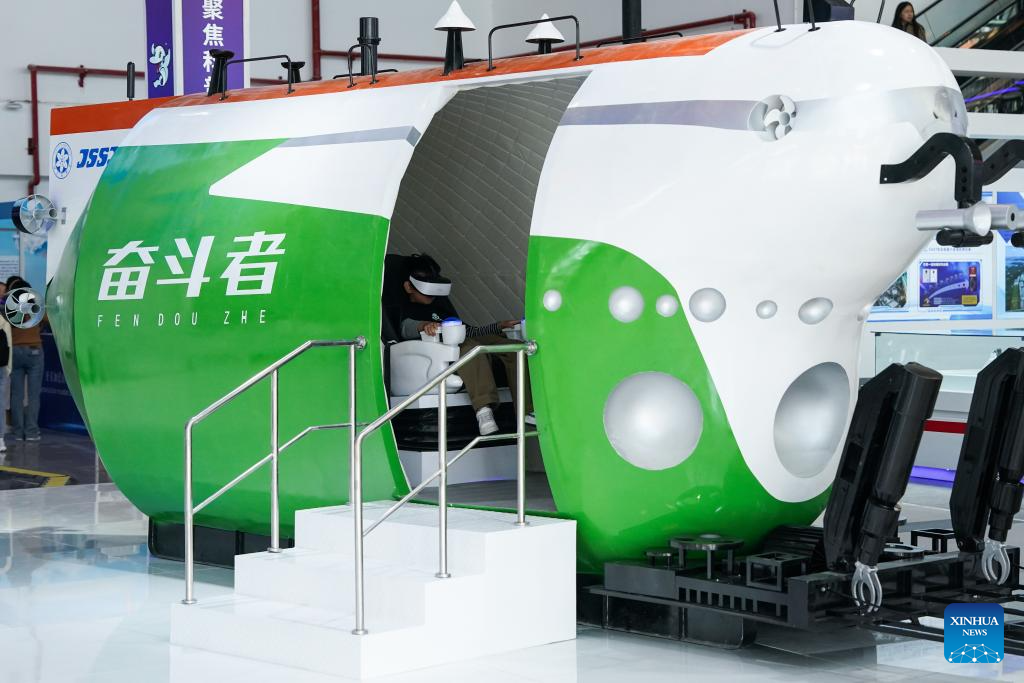 A child tries a simulated cabin of the deep-sea manned submersible Fendouzhe (Striver) during the 11th China (Wuhu) Popularized Science Products Exposition in Wuhu, east China's Anhui Province, Oct. 21, 2023. The expo kicked off here on Saturday. (Xinhua/Du Yu)