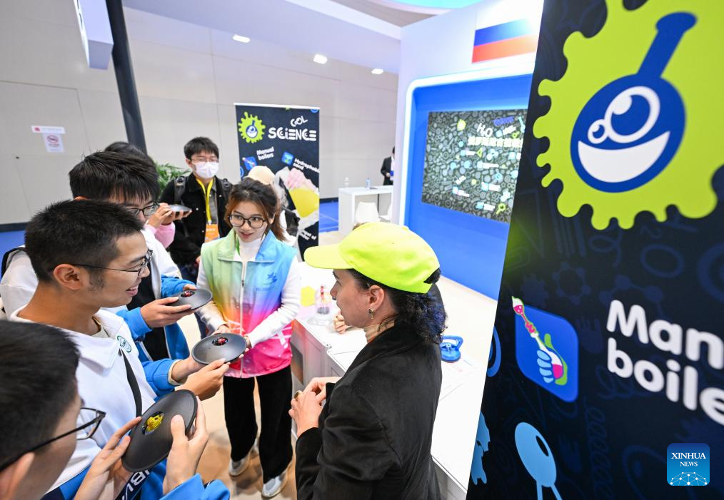 Students interact with staff members at the stand of Russia during the first Donghu Forum in Wuhan, central China's Hubei Province, Oct. 20, 2023. The first Donghu Forum kicked off on Friday in Wuhan. The three-day forum showcases domestic and foreign achievements in science popularization and scientific innovation. Exhibitors from Belt and Road Initiative (BRI) partner countries bring the public various science shows during the forum. (Xinhua/Xiao Yijiu)