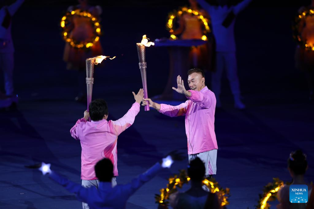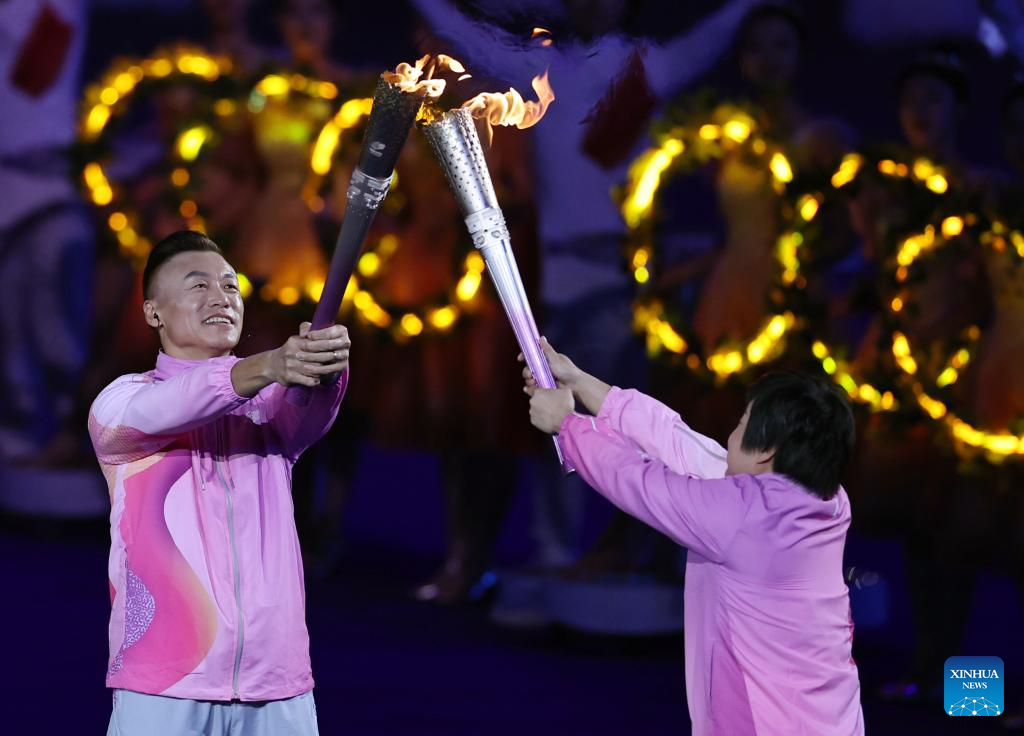 Torch bearer Zhou Guohua (L) passes the torch during the opening ceremony of the 4th Asian Para Games in Hangzhou of east China's Zhejiang Province, on Oct. 22, 2023. (Xinhua/Huang Zongzhi)