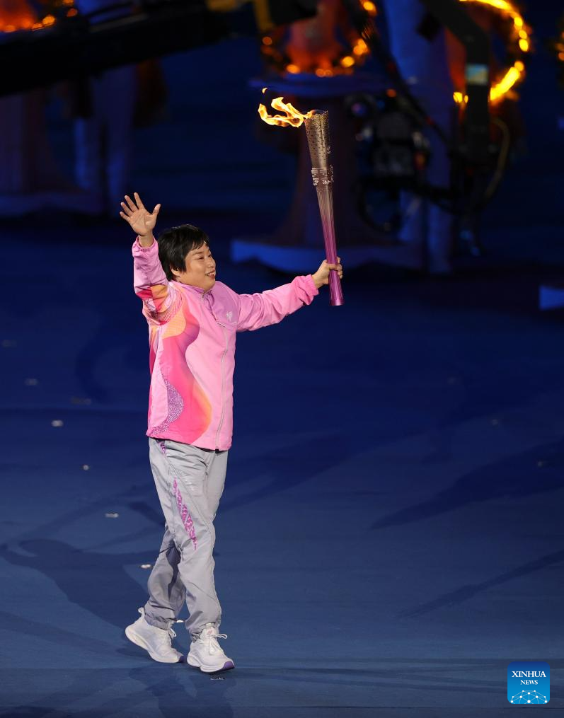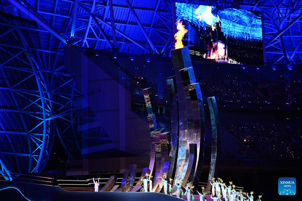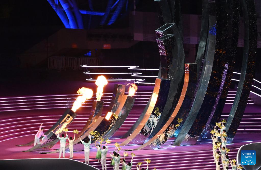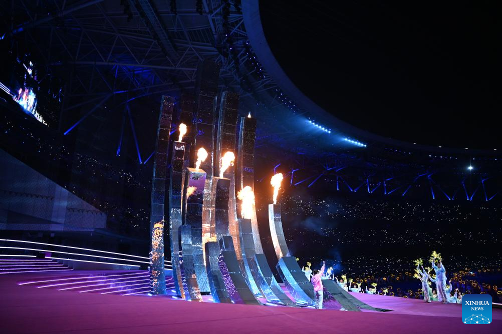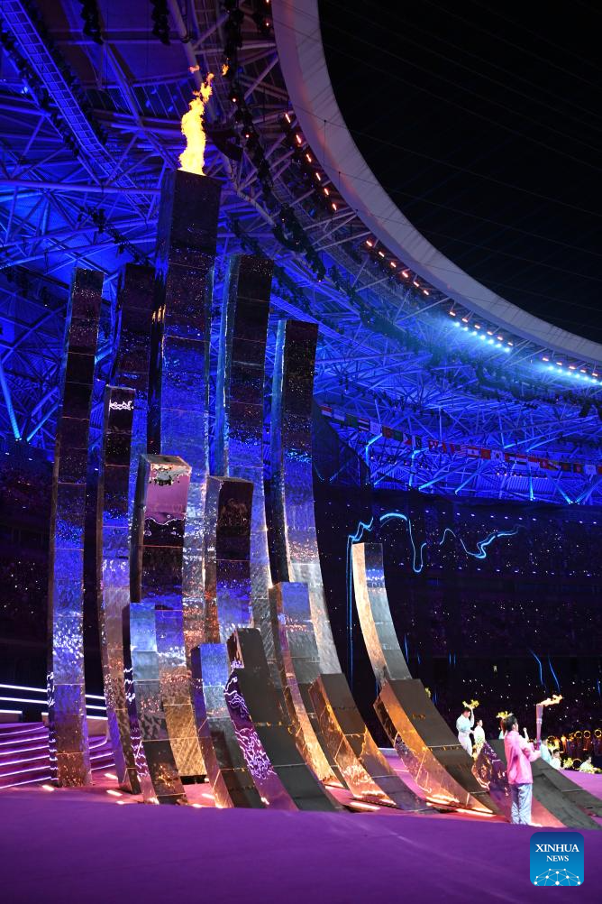 The cauldron is lit during the opening ceremony of the 4th Asian Para Games in Hangzhou of east China's Zhejiang Province, on Oct. 22, 2023. (Xinhua/Huang Zongzhi)