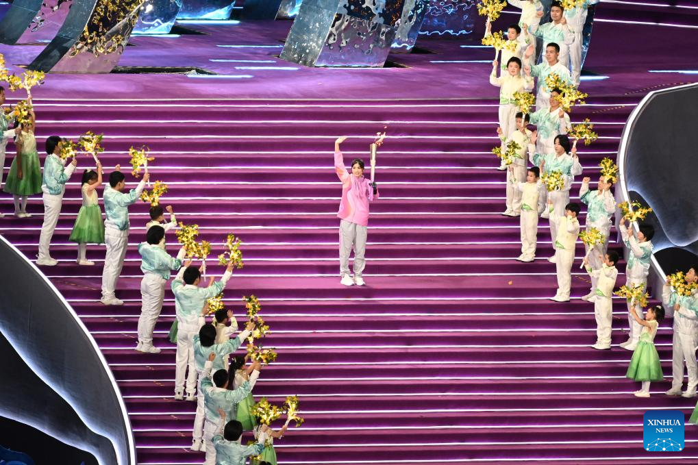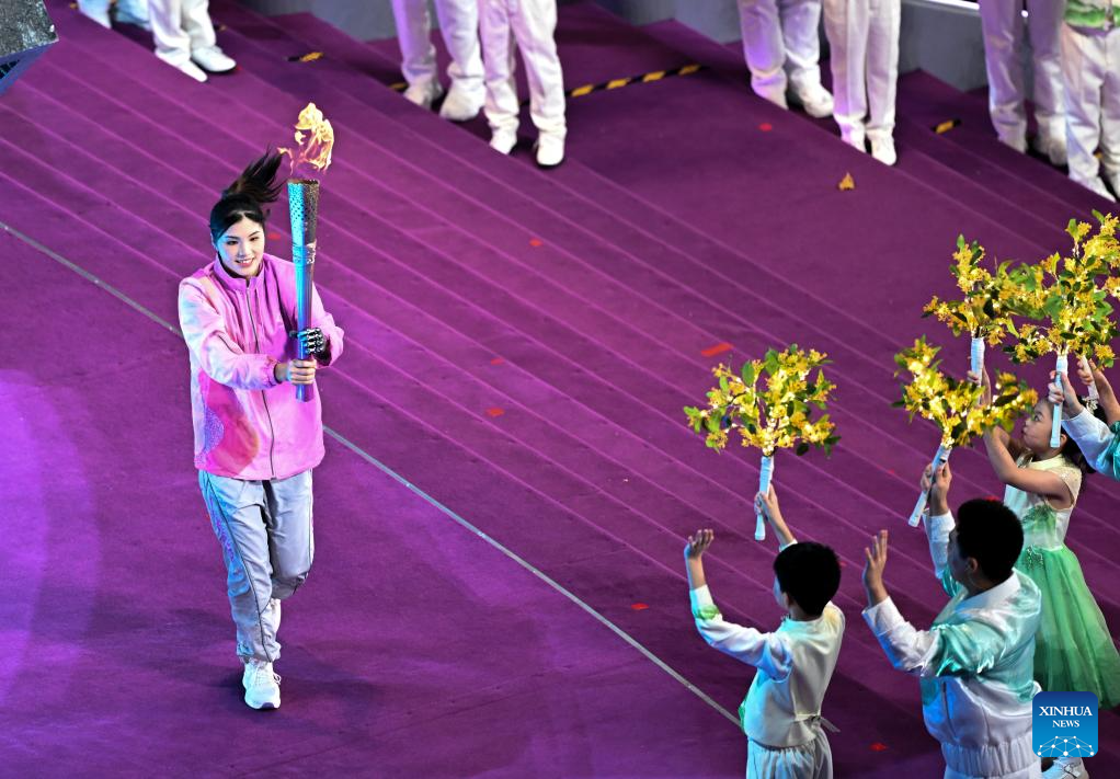 Torch bearer Zheng Xiongying runs with the torch during the opening ceremony of the 4th Asian Para Games in Hangzhou of east China's Zhejiang Province, on Oct. 22, 2023. (Xinhua/Hu Xingyu)