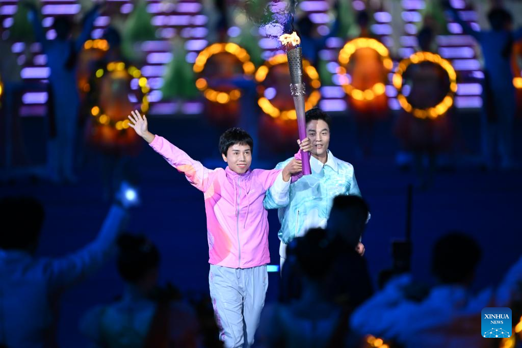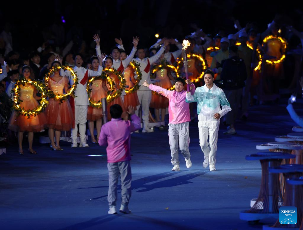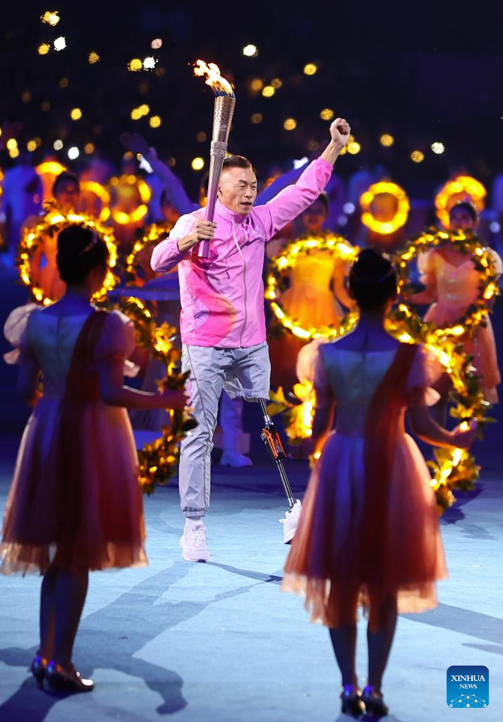 Torch bearer Zhou Guohua (C) relays the torch during the opening ceremony of the 4th Asian Para Games in Hangzhou of east China's Zhejiang Province, on Oct. 22, 2023. (Xinhua/Hu Xingyu)