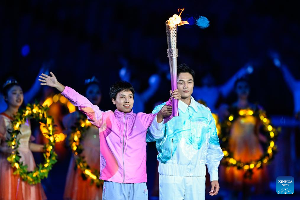 Torch bearer Zheng Xiongying (R) and Hou Bin pass the torch during the opening ceremony of the 4th Asian Para Games in Hangzhou of east China's Zhejiang Province, on Oct. 22, 2023. (Xinhua/Jia Haocheng)