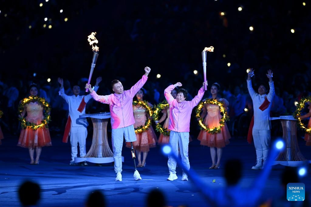 Torch bearer Zheng Xiongying (R) and Hou Bin pass the torch during the opening ceremony of the 4th Asian Para Games in Hangzhou of east China's Zhejiang Province, on Oct. 22, 2023. (Xinhua/Cai Yang)