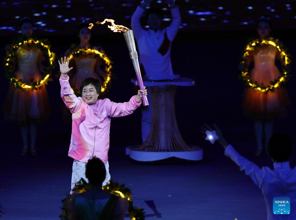 Torch bearer Xu Jialing lights the cauldron during the opening ceremony of the 4th Asian Para Games in Hangzhou of east China's Zhejiang Province, on Oct. 22, 2023. (Xinhua/Li He)
