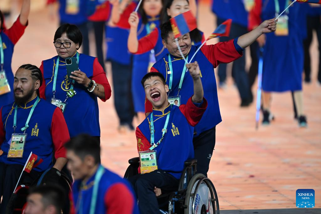 Delegation of Mongolia parade into the Hangzhou Olympic Sports Center Stadium during the opening ceremony of the 4th Asian Para Games in Hangzhou of east China's Zhejiang Province, on Oct. 22, 2023. (Xinhua/Cai Yang)