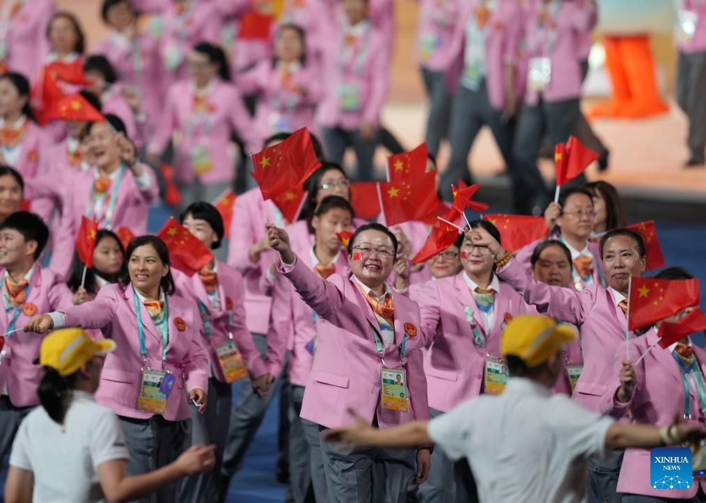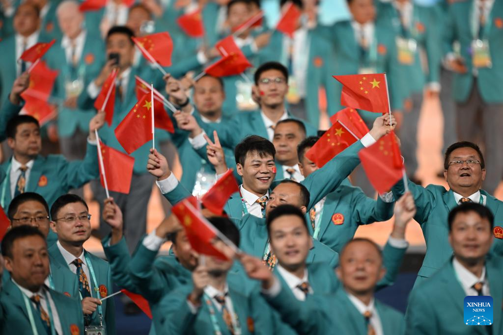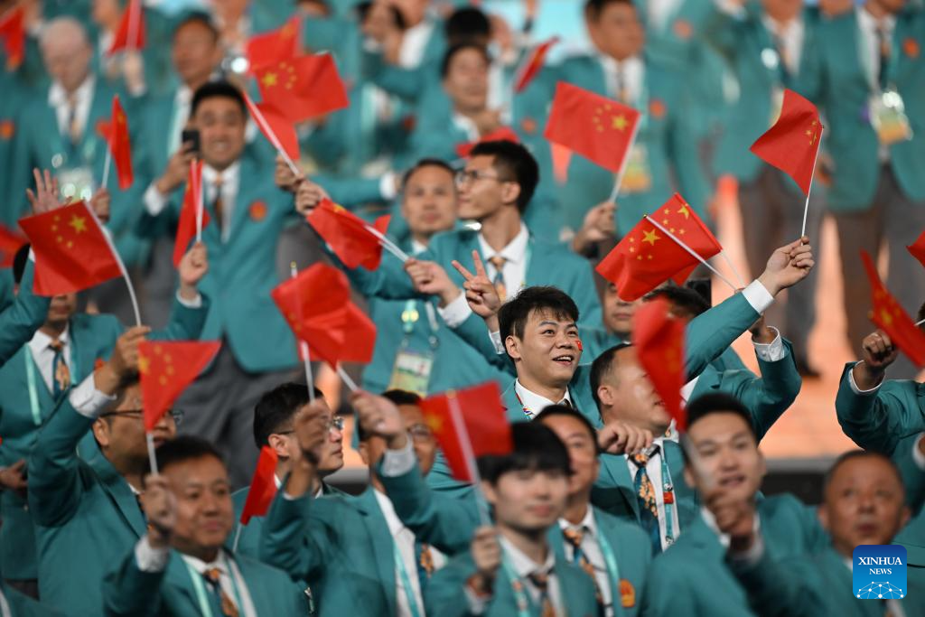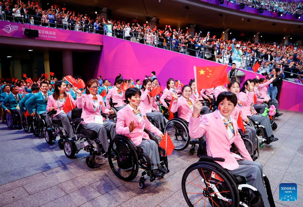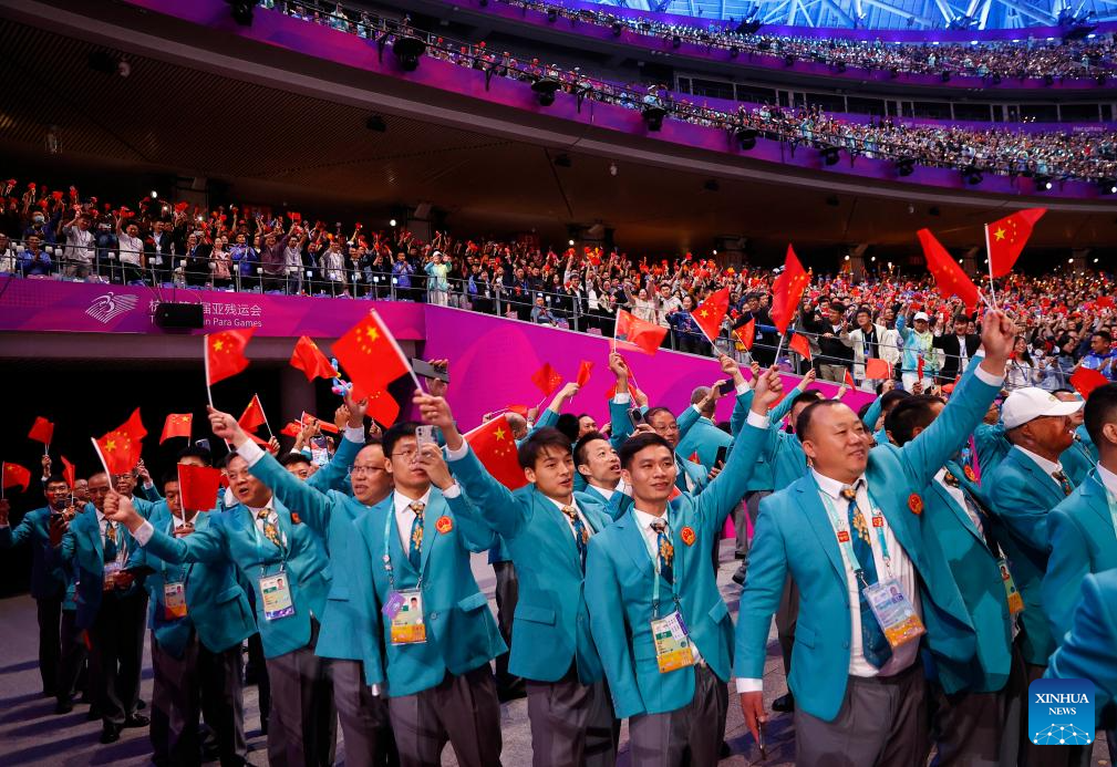 Delegation of China parade into the Hangzhou Olympic Sports Center Stadium during the opening ceremony of the 4th Asian Para Games in Hangzhou of east China's Zhejiang Province, on Oct. 22, 2023. (Xinhua/Hu Xingyu)
