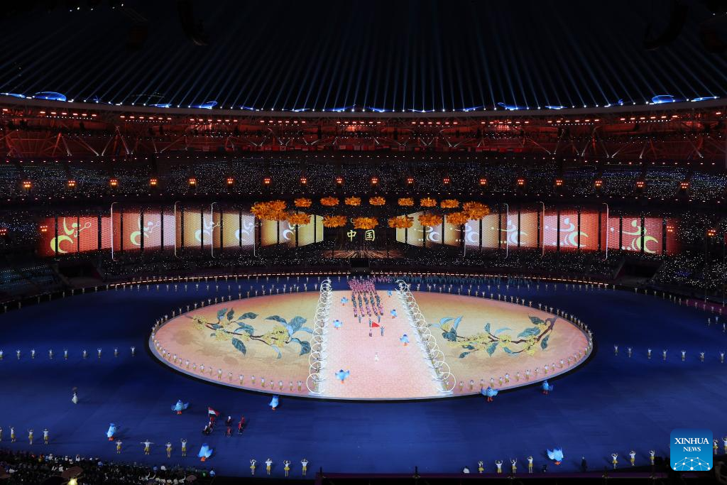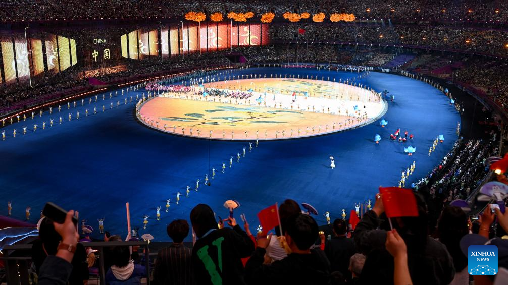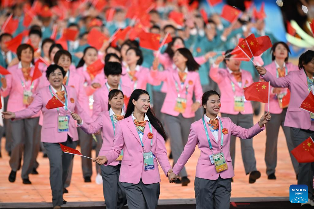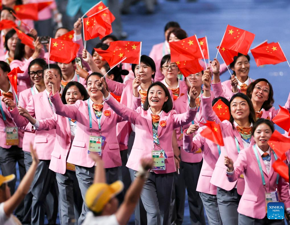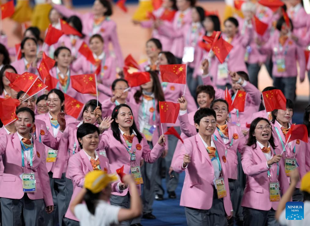 Delegation of China parade into the Hangzhou Olympic Sports Center Stadium during the opening ceremony of the 4th Asian Para Games in Hangzhou of east China's Zhejiang Province, on Oct. 22, 2023. (Xinhua/Hu Xingyu)