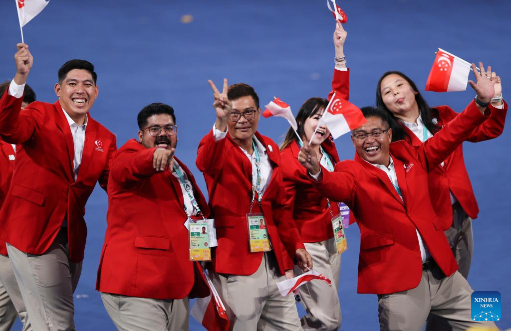 Delegation of Singapore parade into the Hangzhou Olympic Sports Center Stadium during the opening ceremony of the 4th Asian Para Games in Hangzhou of east China's Zhejiang Province, on Oct. 22, 2023. (Xinhua/Hu Xingyu)