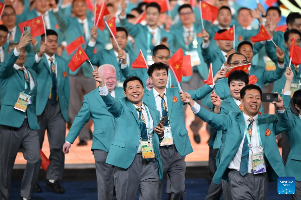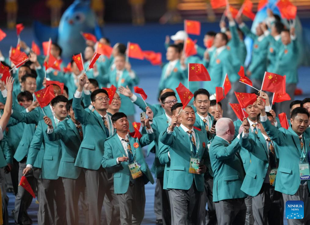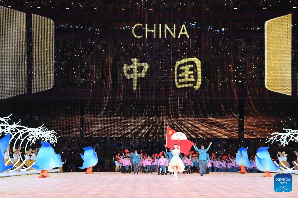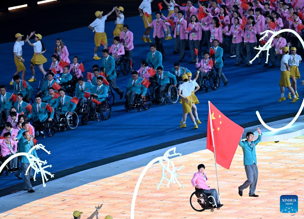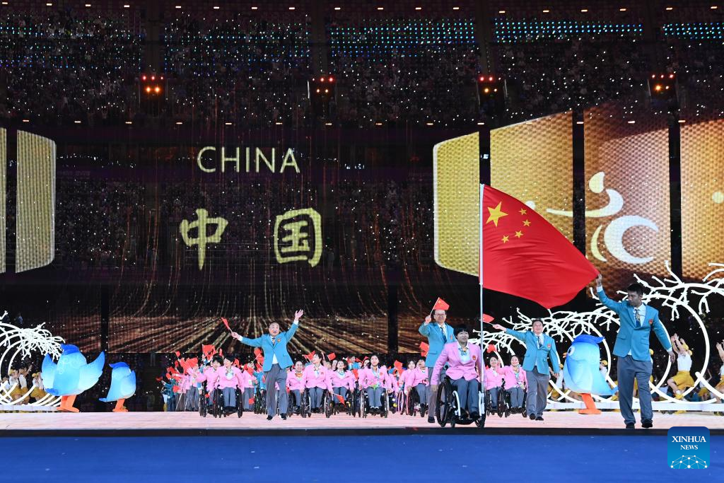 Delegation of China parade into the Hangzhou Olympic Sports Center Stadium during the opening ceremony of the 4th Asian Para Games in Hangzhou of east China's Zhejiang Province, on Oct. 22, 2023. (Xinhua/Bei He)