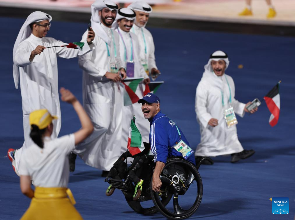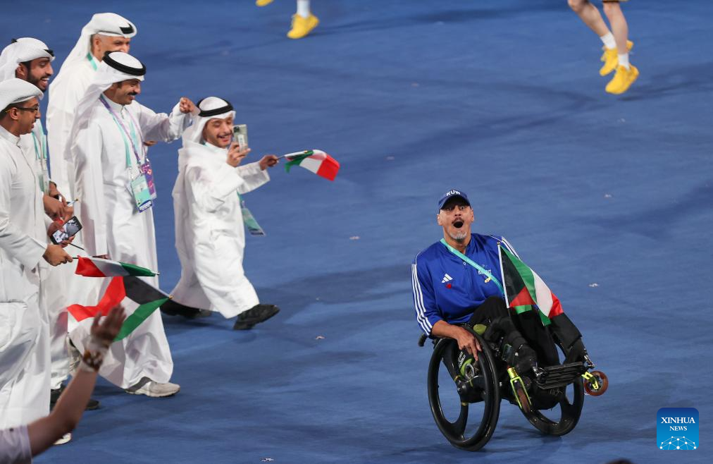 Delegation of Kuwait parade into the Hangzhou Olympic Sports Center Stadium during the opening ceremony of the 4th Asian Para Games in Hangzhou of east China's Zhejiang Province, on Oct. 22, 2023. (Xinhua/Jia Haocheng)