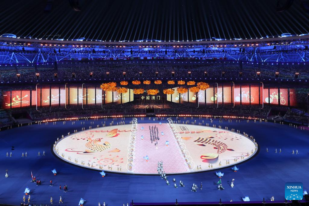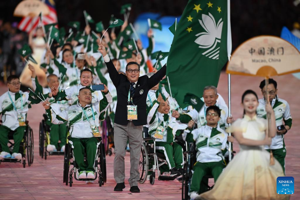Delegation of Macao, China parade into the Hangzhou Olympic Sports Center Stadium during the opening ceremony of the 4th Asian Para Games in Hangzhou of east China's Zhejiang Province, on Oct. 22, 2023. (Xinhua/Xu Yu)