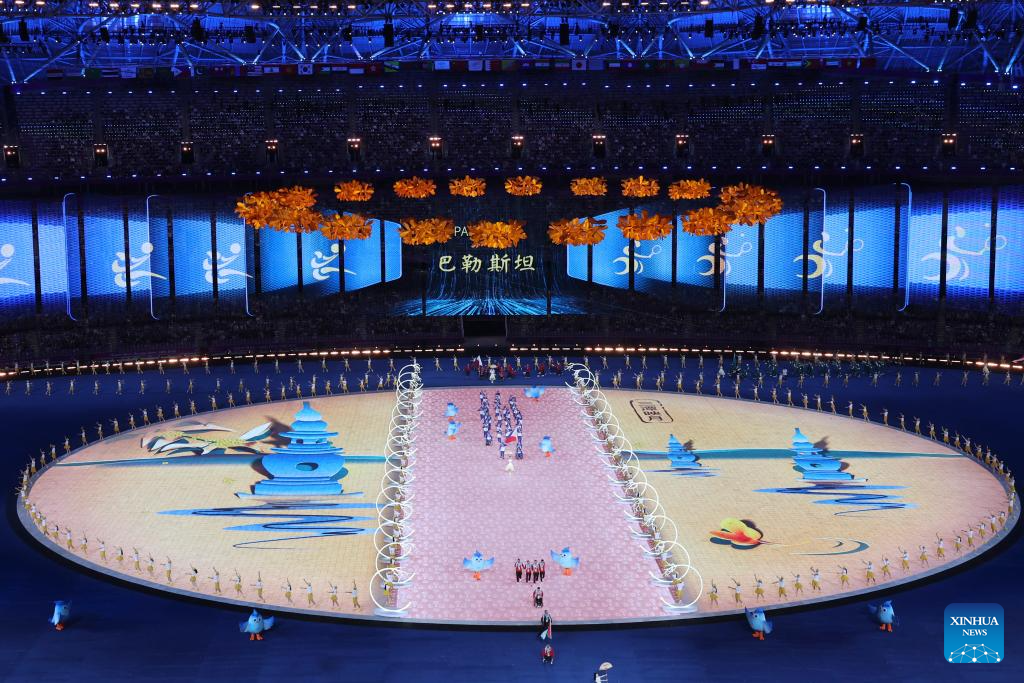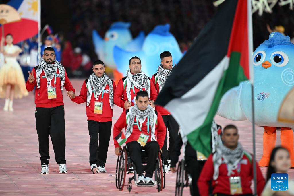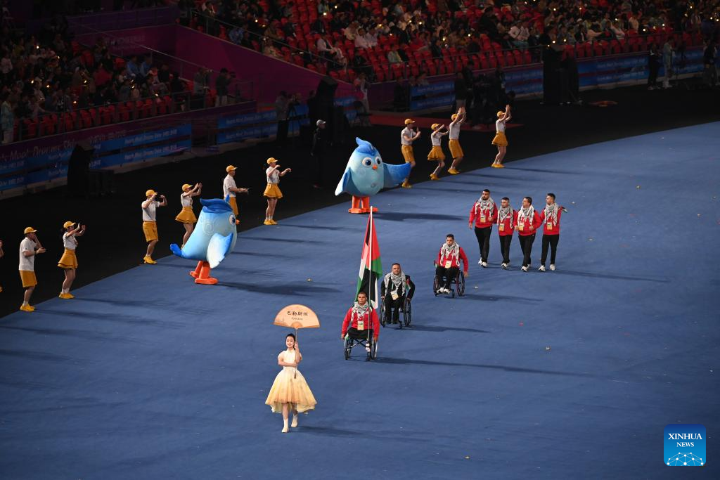 Delegation of Palestine parade into the Hangzhou Olympic Sports Center Stadium during the opening ceremony of the 4th Asian Para Games in Hangzhou of east China's Zhejiang Province, on Oct. 22, 2023. (Xinhua/Xu Yu)
