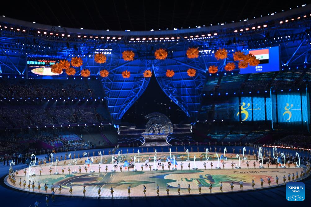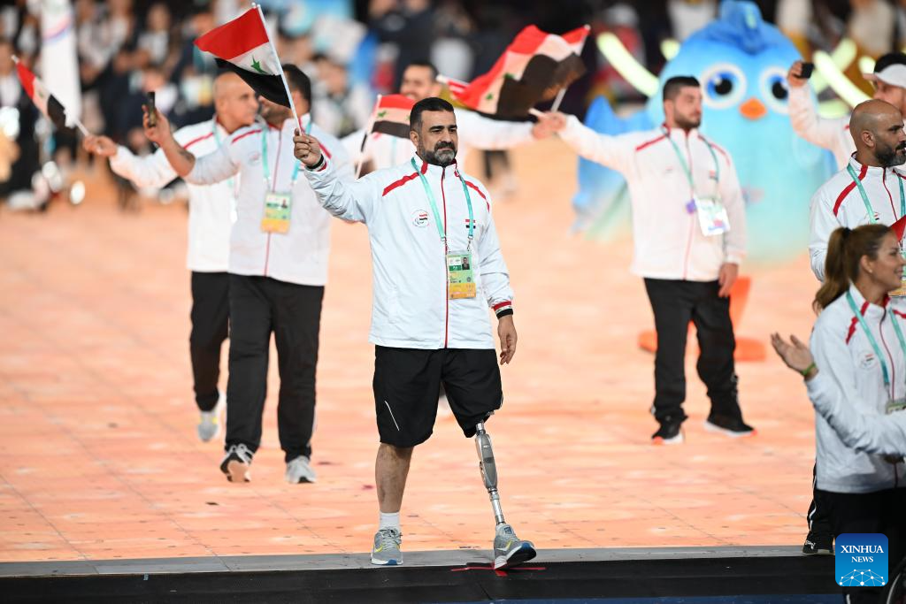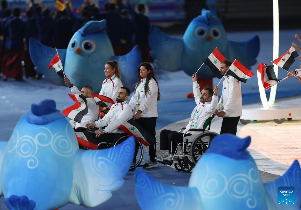 Delegation of Syria parade into the Hangzhou Olympic Sports Center Stadium during the opening ceremony of the 4th Asian Para Games in Hangzhou of east China's Zhejiang Province, on Oct. 22, 2023. (Xinhua/Hu Xingyu)