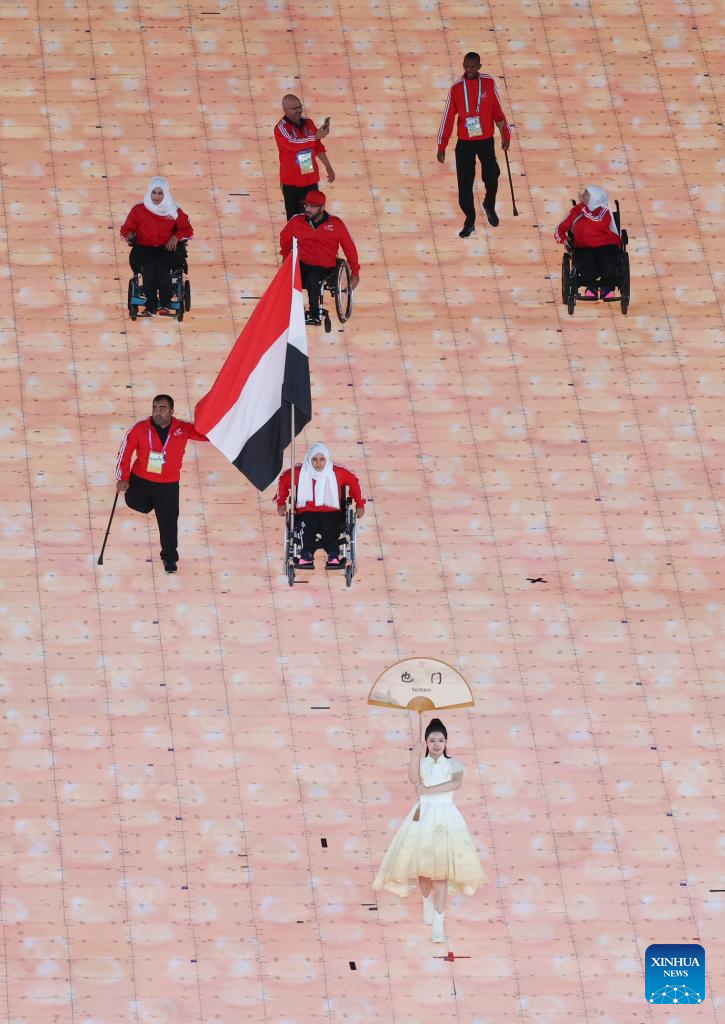 Delegation of Yemen parade into the Hangzhou Olympic Sports Center Stadium during the opening ceremony of the 4th Asian Para Games in Hangzhou of east China's Zhejiang Province, on Oct. 22, 2023. (Xinhua/Xu Yu)