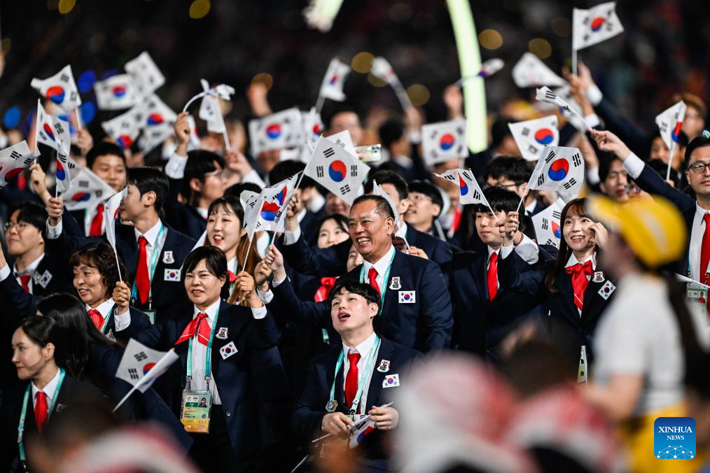 Delegation of South Korea parade into the Hangzhou Olympic Sports Center Stadium during the opening ceremony of the 4th Asian Para Games in Hangzhou of east China's Zhejiang Province, on Oct. 22, 2023. (Xinhua/Wu Zhizun)