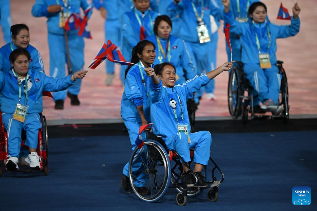 Delegation of Laos parade into the Hangzhou Olympic Sports Center Stadium during the opening ceremony of the 4th Asian Para Games in Hangzhou of east China's Zhejiang Province, on Oct. 22, 2023. (Xinhua/Cai Yang)