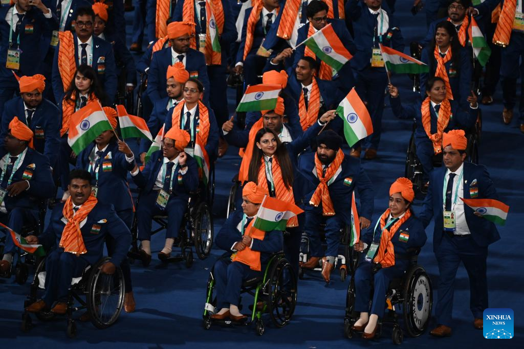 Delegation of India parade into the Hangzhou Olympic Sports Center Stadium during the opening ceremony of the 4th Asian Para Games in Hangzhou of east China's Zhejiang Province, on Oct. 22, 2023. (Xinhua/Huang Zongzhi)
