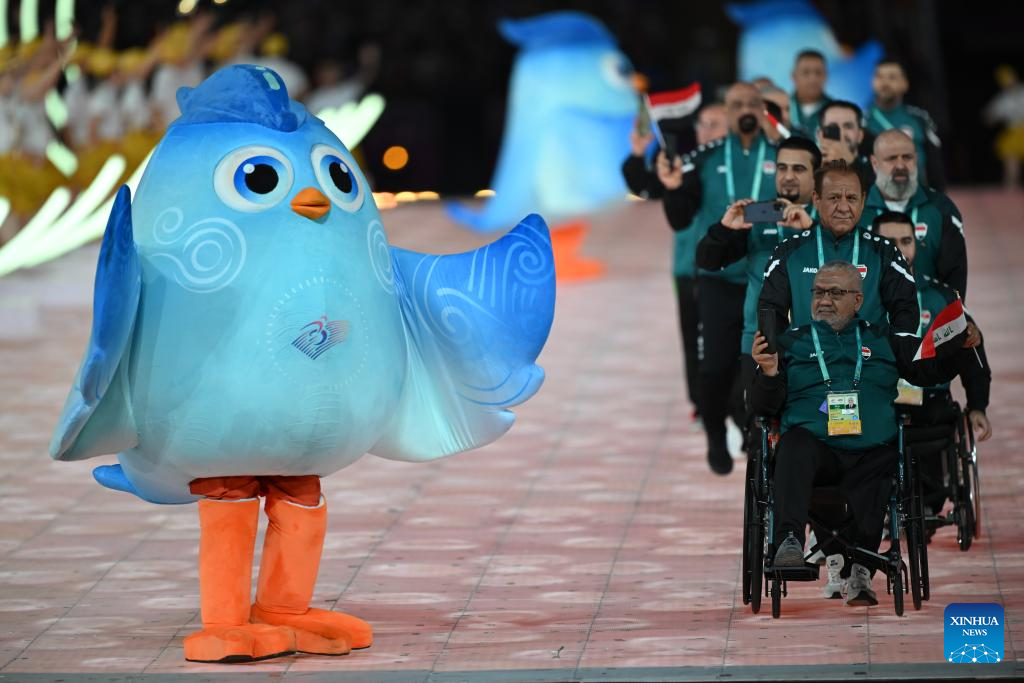 Delegation of Iraq parade into the Hangzhou Olympic Sports Center Stadium during the opening ceremony of the 4th Asian Para Games in Hangzhou of east China's Zhejiang Province, on Oct. 22, 2023. (Xinhua/Wu Zhizun)