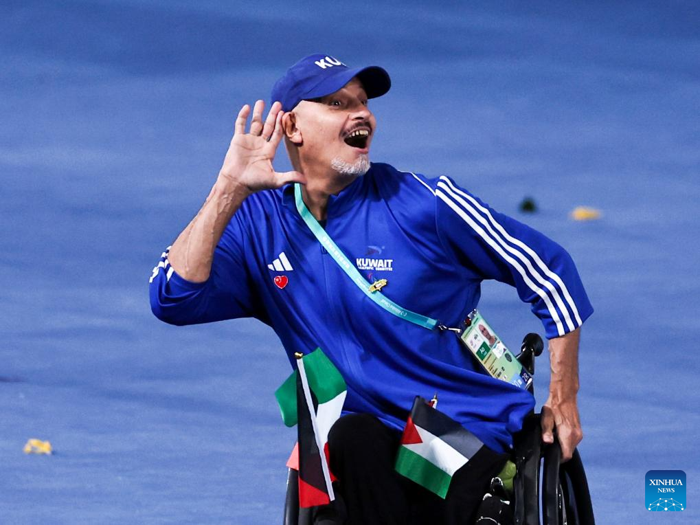 A member of delegation of Kuwait reacts during the opening ceremony of the 4th Asian Para Games in Hangzhou of east China's Zhejiang Province, on Oct. 22, 2023. (Xinhua/Hu Xingyu)