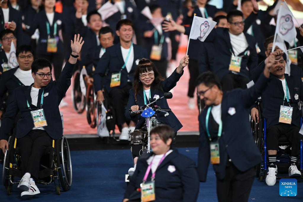 Delegation of Chinese Taipei parade into the Hangzhou Olympic Sports Center Stadium during the opening ceremony of the 4th Asian Para Games in Hangzhou of east China's Zhejiang Province, on Oct. 22, 2023. (Xinhua/Cai Yang)