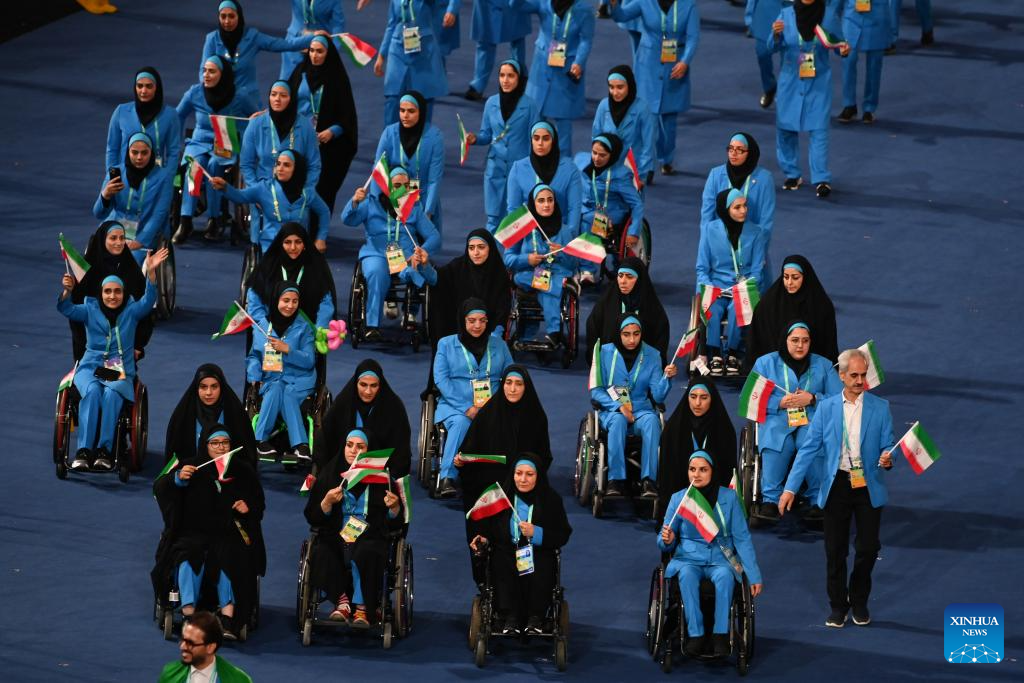Delegation of Iran parade into the Hangzhou Olympic Sports Center Stadium during the opening ceremony of the 4th Asian Para Games in Hangzhou of east China's Zhejiang Province, on Oct. 22, 2023. (Xinhua/Huang Zongzhi)