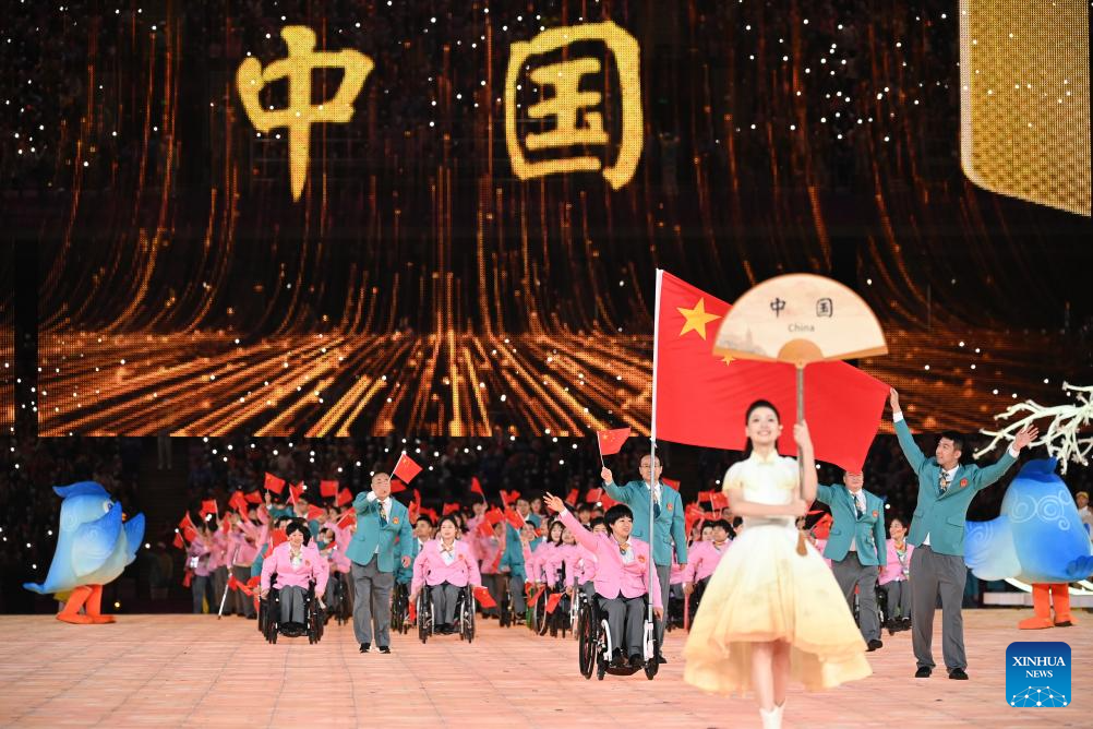 Delegation of China parade into the Hangzhou Olympic Sports Center Stadium during the opening ceremony of the 4th Asian Para Games in Hangzhou of east China's Zhejiang Province, on Oct. 22, 2023. (Xinhua/Han Chuanhao)