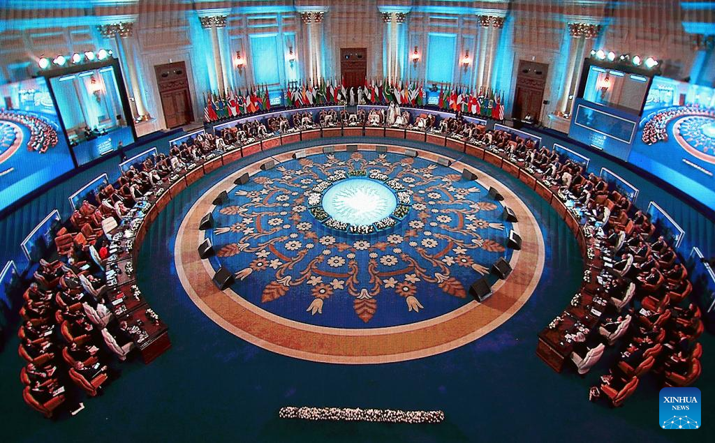 A screen at the media center of an international peace summit shows a scene of the summit in Cairo, Egypt, Oct 21, 2023. An international peace summit concluded Saturday at Egypt's new administrative capital east of Cairo, where heads of state and ministers from several countries urged for an end to the ongoing Israel-Hamas armed conflict in the Gaza Strip. [Photo/Xinhua]