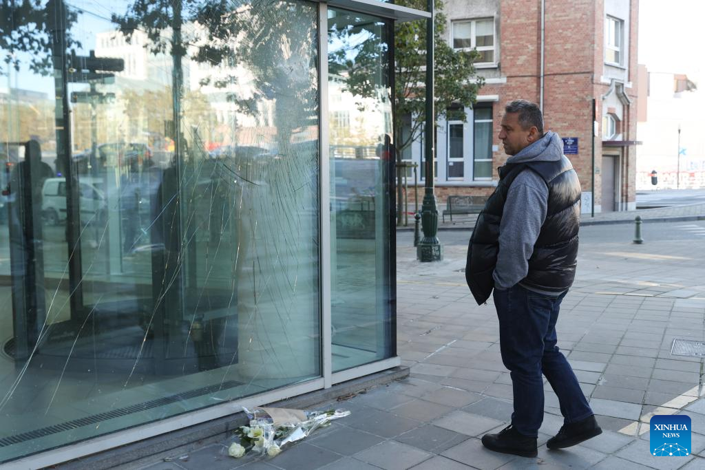 A man checks the bullet hole of Monday evening's shooting in Brussels, Belgium, Oct 17, 2023. Belgium's Federal Prosecutor's Office confirmed on Tuesday that the suspect in Monday evening's shooting in Brussels that resulted in two deaths and one injury has been identified and is deceased. The killing of the two Swedes in Brussels was "a terror attack aimed at Sweden and Swedes," Swedish Prime Minister Ulf Kristersson said on Tuesday at a press conference. [Photo/Xinhua]
