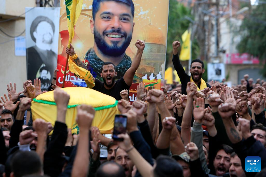 Supporters mourn a Hezbollah fighter killed in clashes with Israeli soldiers in Mays Al Jabal, south Lebanon, on Oct 19, 2023. One Hezbollah fighter was killed and three civilians were wounded on Thursday in confrontations between Israeli forces and Hezbollah along the Lebanese-Israeli borders. The escalation on the Lebanese-Israeli border began when Hezbollah fired multiple rockets on Oct 8 toward Israeli military sites in support of a Hamas surprise attack against Israel. In response, the Israeli forces fired heavy artillery on southeastern Lebanon on the same day. [Photo/Xinhua]