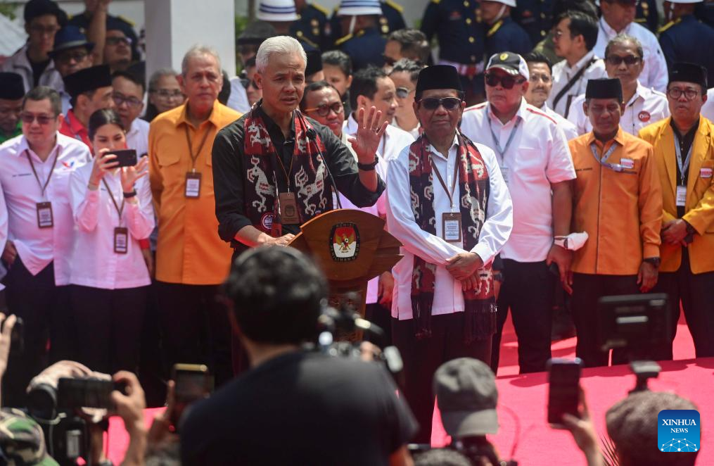 Indonesian presidential candidate Ganjar Pranowo delivers a press statement at the elections commission building in Jakarta, Indonesia, Oct 19, 2023. Indonesia is set to hold a presidential election in Feb 2024. [Photo/Xinhua]