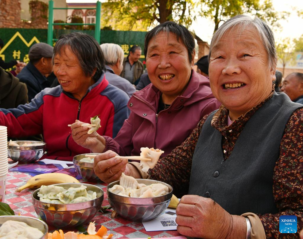 Elders eat dumplings at a cultural square in Donglizhuang Village of Luancheng District in Shijiazhuang, north China's Hebei Province, Oct. 22, 2023. The Chongyang Festival, also known as the Double Ninth Festival, is an annual festival to show respect and care for the elderly throughout China. The festival falls on the ninth day of the ninth Chinese lunar month, which is October 23 this year. (Photo by Li Mingfa/Xinhua)