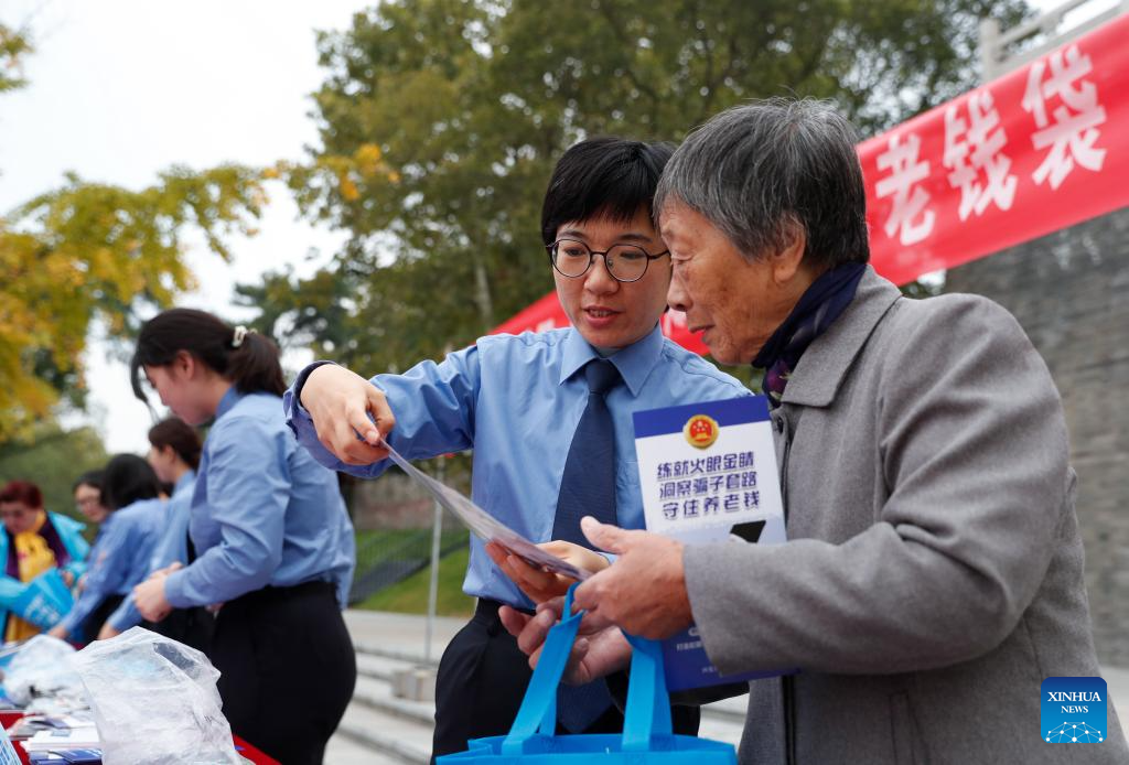 An anti-fraud awareness campaign is held for elders at a park in Xinghua, east China's Jiangsu Province, Oct. 22, 2023. The Chongyang Festival, also known as the Double Ninth Festival, is an annual festival to show respect and care for the elderly throughout China. The festival falls on the ninth day of the ninth Chinese lunar month, which is October 23 this year. (Photo by Zhou Shegen/Xinhua)