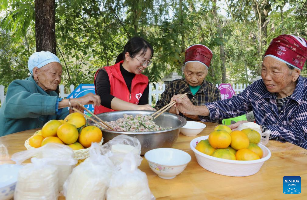 A volunteer and elders make dumplings at a Chongyang Festival activity in Gaobei Village of Ganxi Township in Shibing County, Qiandongnan Miao and Dong Autonomous Prefecture, southwest China's Guizhou Province, Oct. 22, 2023. The Chongyang Festival, also known as the Double Ninth Festival, is an annual festival to show respect and care for the elderly throughout China. The festival falls on the ninth day of the ninth Chinese lunar month, which is October 23 this year. (Photo by Tai Shengzhi/Xinhua)