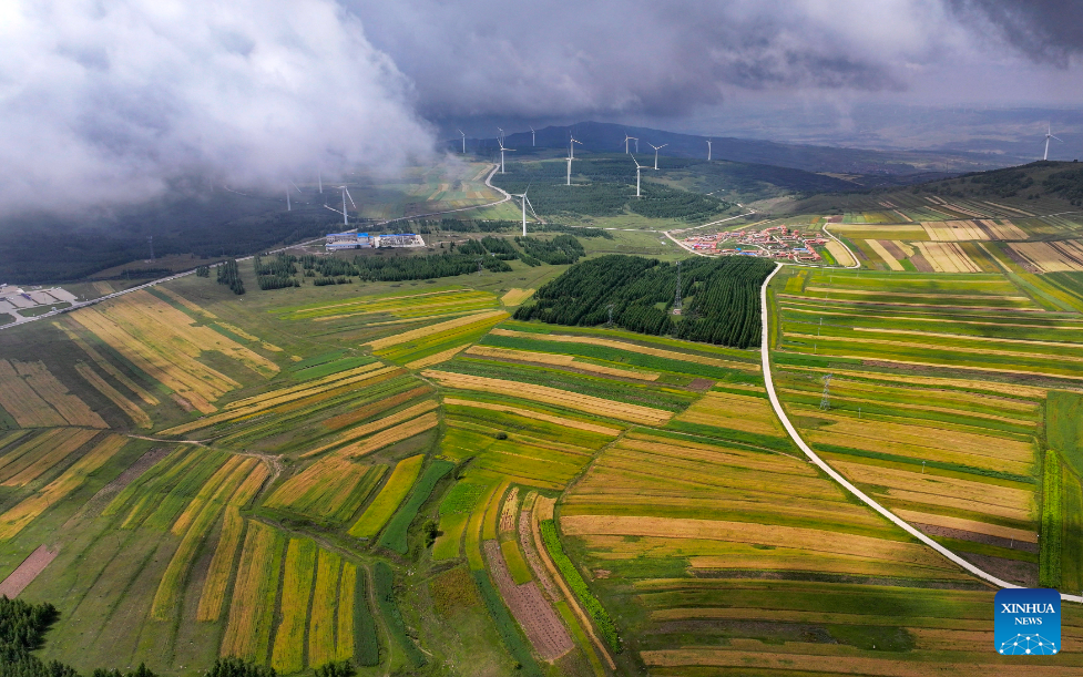 This aerial photo shows the view of farmland in Shangyi County, Zhangjiakou City, north China's Hebei Province, August 27, 2023. In autumn, leaves change color as the temperature falls. Green, yellow, orange, and red hues paint the landscape in north China, creating beautiful color palettes. (Photo by Wu Diansen/Xinhua)