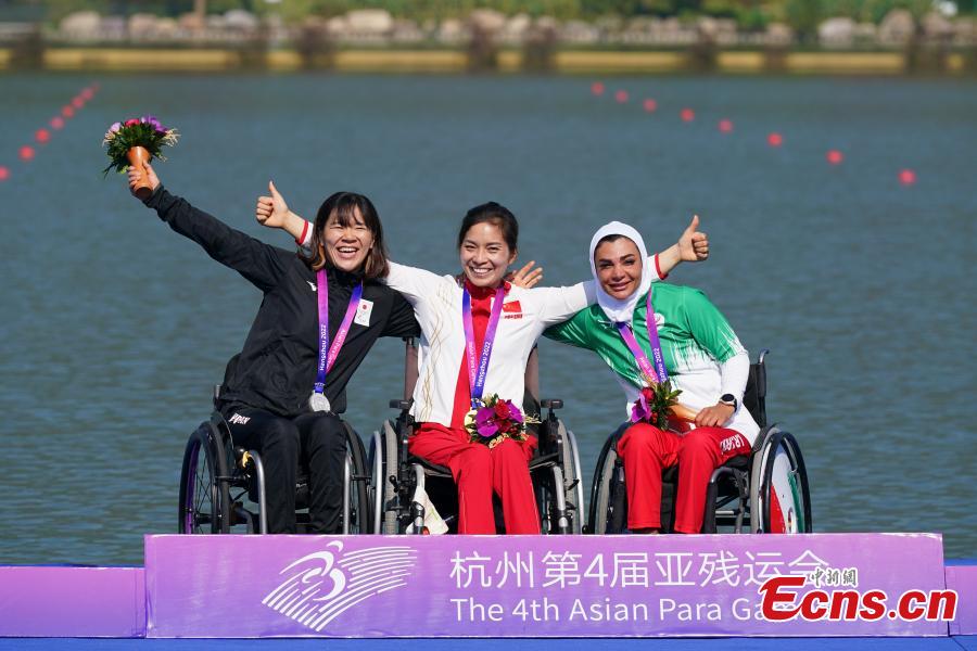 Gold medalist Xie Maosan (C) of China, silver medalist Seryu Monika (L) of Japan and bronze medalist Sara Abdolmaleki of Iran attend the awarding ceremony for the Women's KL1 of Canoe during the 4th Asian Para Games in Hangzhou, east China's Zhejiang Province, Oct. 23, 2023. (Photo: China News Service/Liu Ranyang)
