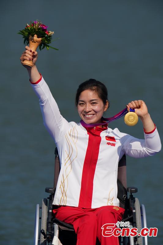 China's Xie Maosan poses for a photo at the awarding ceremony for the Women's KL1 of Canoe during the 4th Asian Para Games in Hangzhou, east China's Zhejiang Province, Oct. 23, 2023. (Photo: China News Service/Liu Ranyang)