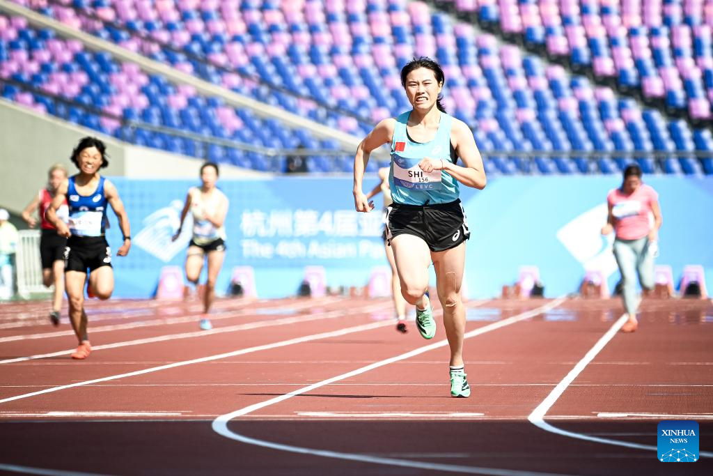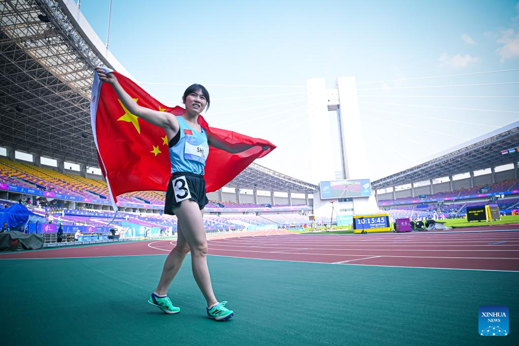 Shi Yiting of China celebrates after the Women's 200m-T36 final at the 4th Asian Para Games in Hangzhou, east China's Zhejiang Province, Oct. 23, 2023. (Xinhua/Jiang Han)