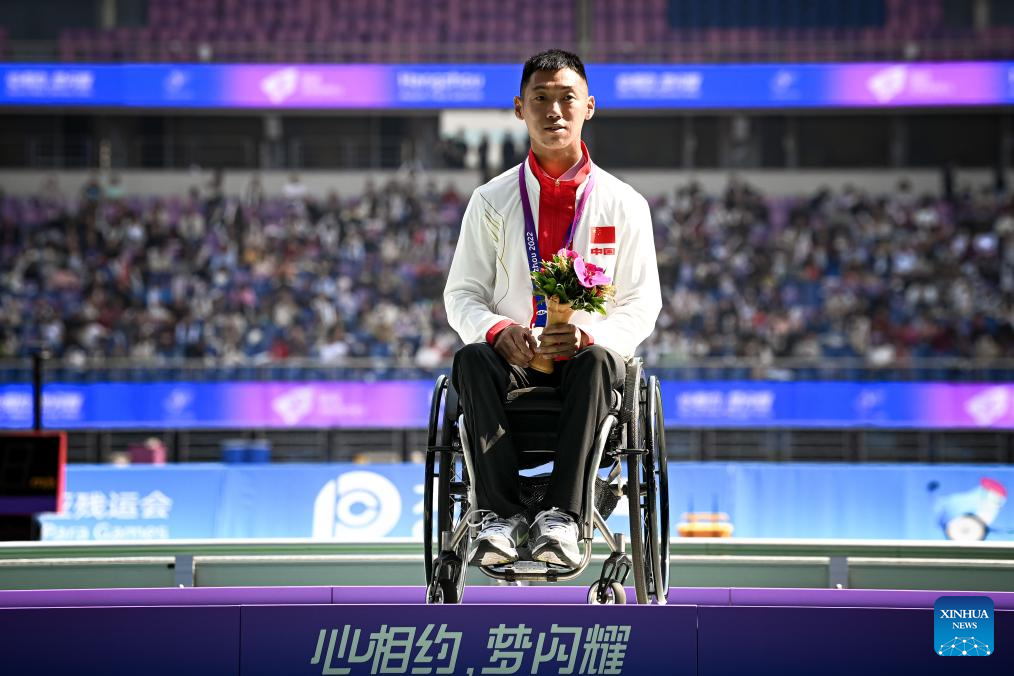Silver medalist Gong Wenhao of China celebrates during the awarding ceremony for Men's 100m-T34 Final at the 4th Asian Para Games in Hangzhou, east China's Zhejiang Province, Oct. 23, 2023. (Xinhua/Jiang Han)