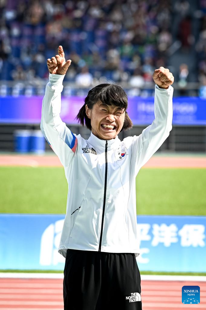 Silver medalist Jeon Minjae of South Korea celebrates after the Women's 200m-T36 final at the 4th Asian Para Games in Hangzhou, east China's Zhejiang Province, Oct. 23, 2023. (Xinhua/Jiang Han)