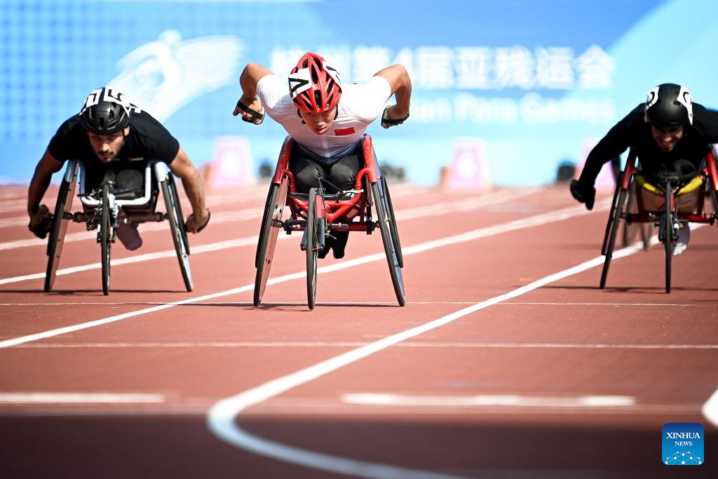 Gong Wenhao of China (C) competes during the Men's 100m-T34 Final at the 4th Asian Para Games in Hangzhou, east China's Zhejiang Province, Oct. 23, 2023. (Xinhua/Jiang Han)