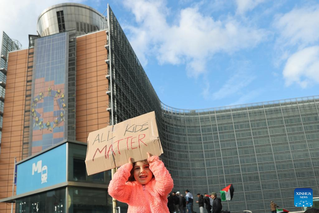 A child holding a placard is pictured at a demonstration near the European Union headquarters in Brussels, Belgium, Oct. 22, 2023. A large demonstration rallied on Sunday afternoon in Brussels, calling for an immediate ceasefire in Gaza Strip.(Xinhua/Zhao Dingzhe)