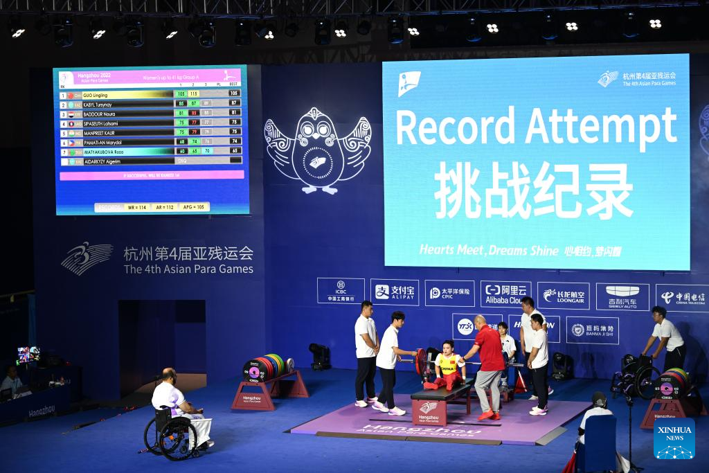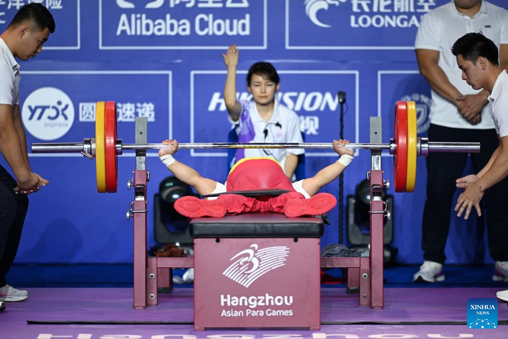 Guo Lingling of China competes during the Women's 41kg Final of Powerlifting during the 4th Asian Para Games in Hangzhou, east China's Zhejiang Province, Oct. 23, 2023. (Xinhua/Bei He)
