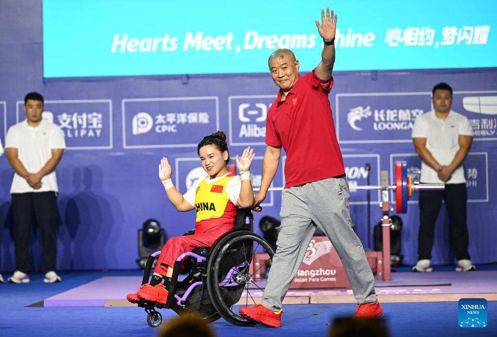Guo Lingling of China reacts after the Women's 41kg Final of Powerlifting during the 4th Asian Para Games in Hangzhou, east China's Zhejiang Province, Oct. 23, 2023. (Xinhua/Bei He)