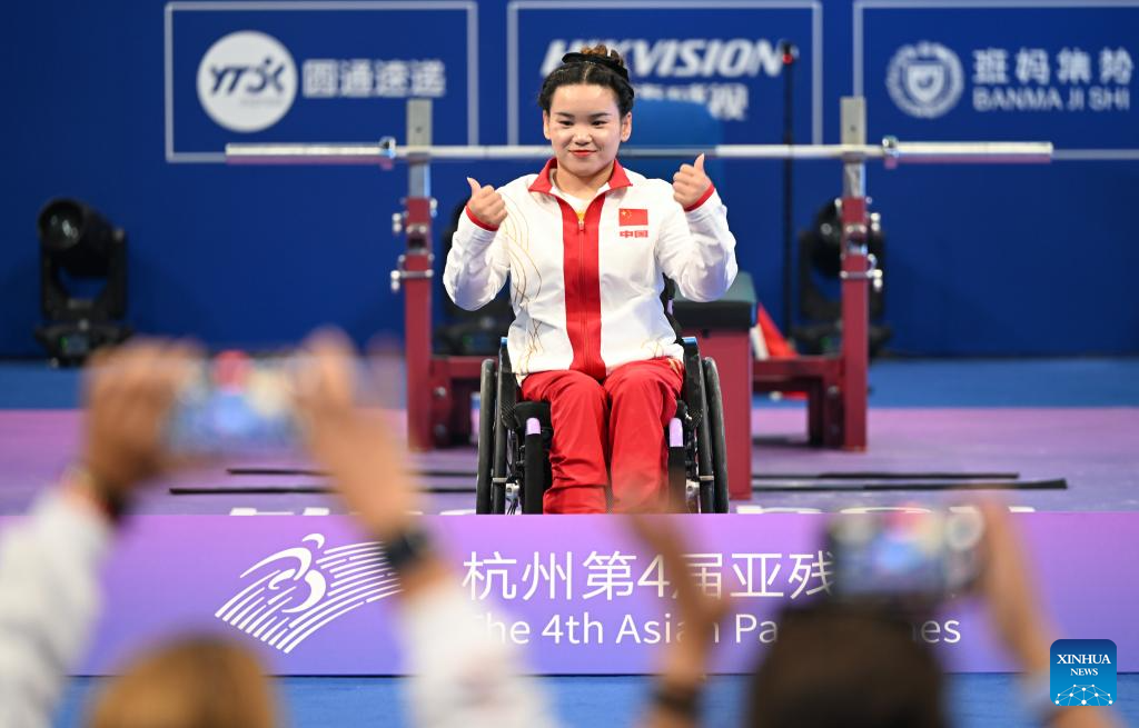 Gold medalist Guo Lingling of China attends the awarding ceremony for the Women's 41kg of Powerlifting during the 4th Asian Para Games in Hangzhou, east China's Zhejiang Province, Oct. 23, 2023. (Xinhua/Bei He)