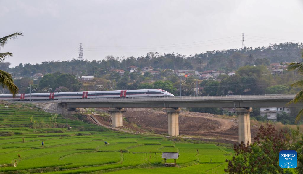This photo taken on Oct. 16, 2023 shows a high-speed electrical multiple unit (EMU) train running on the Jakarta-Bandung High-Speed Railway in Padalarang, Indonesia. (Photo/Xinhua)