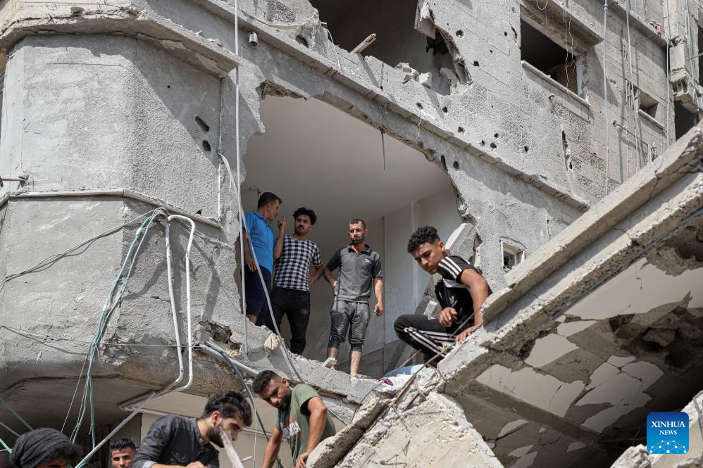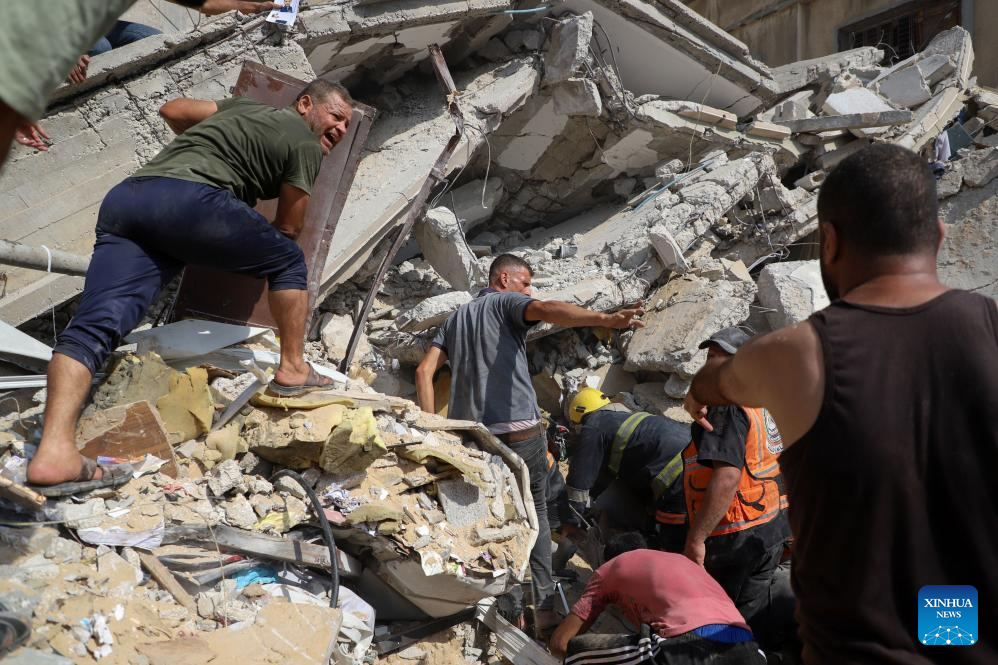 People conduct rescue work after Israeli airstrikes in the southern Gaza Strip city of Khan Younis, Oct. 24, 2023. The death toll of Palestinians from Israeli airstrikes on the Gaza Strip has risen to 5,791, the Hamas-run Health Ministry said on Tuesday. (Photo by Rizek Abdeljawad/Xinhua)